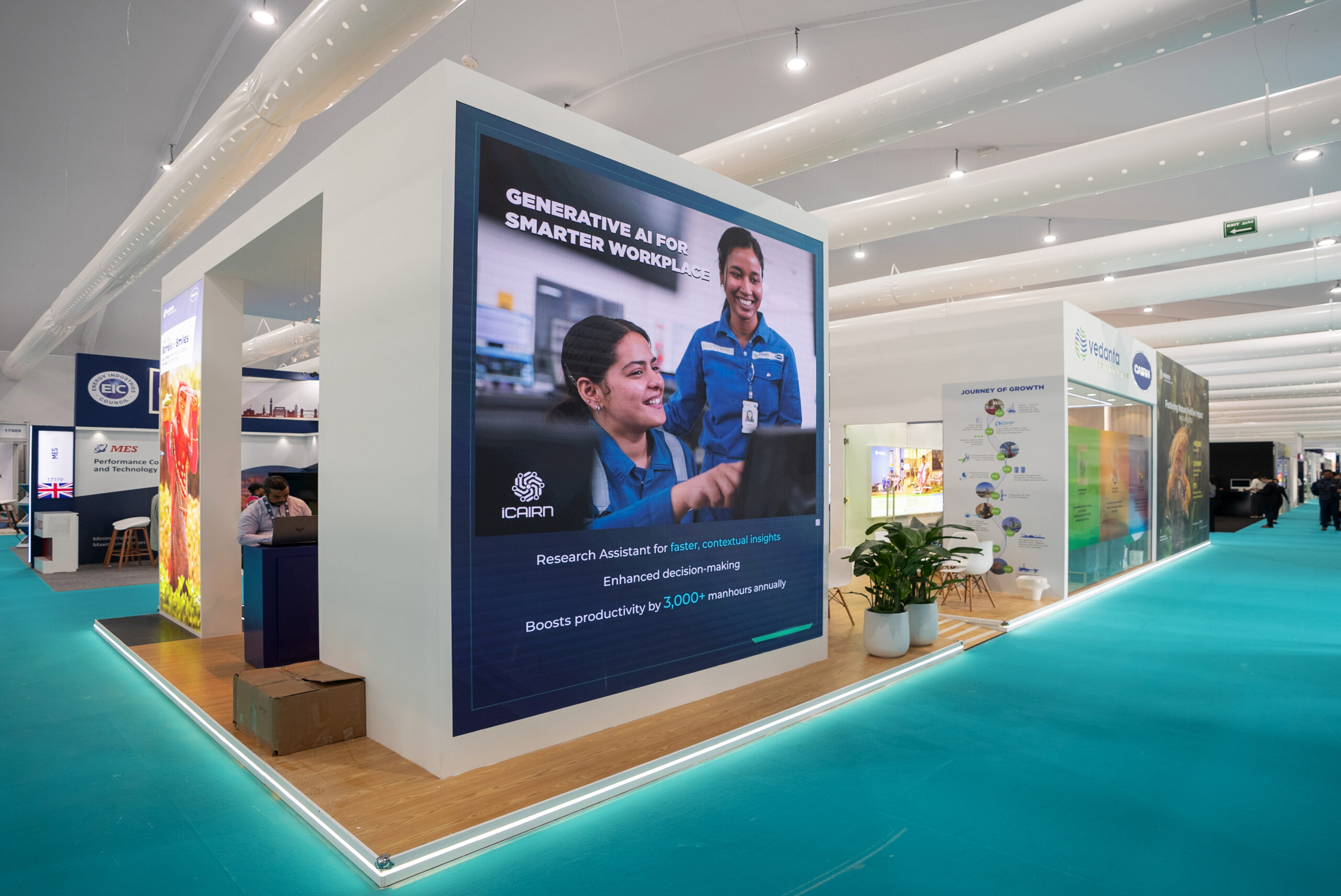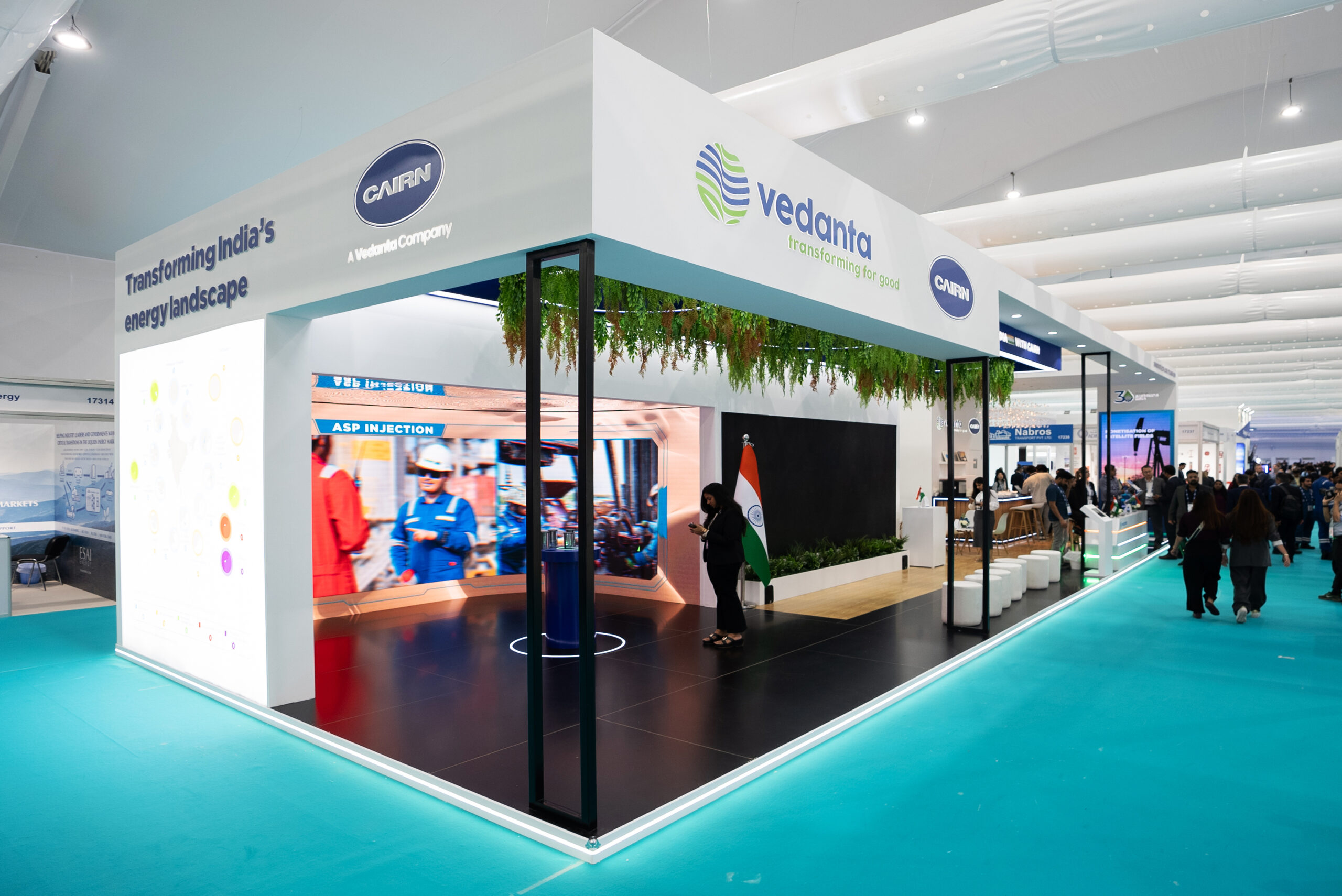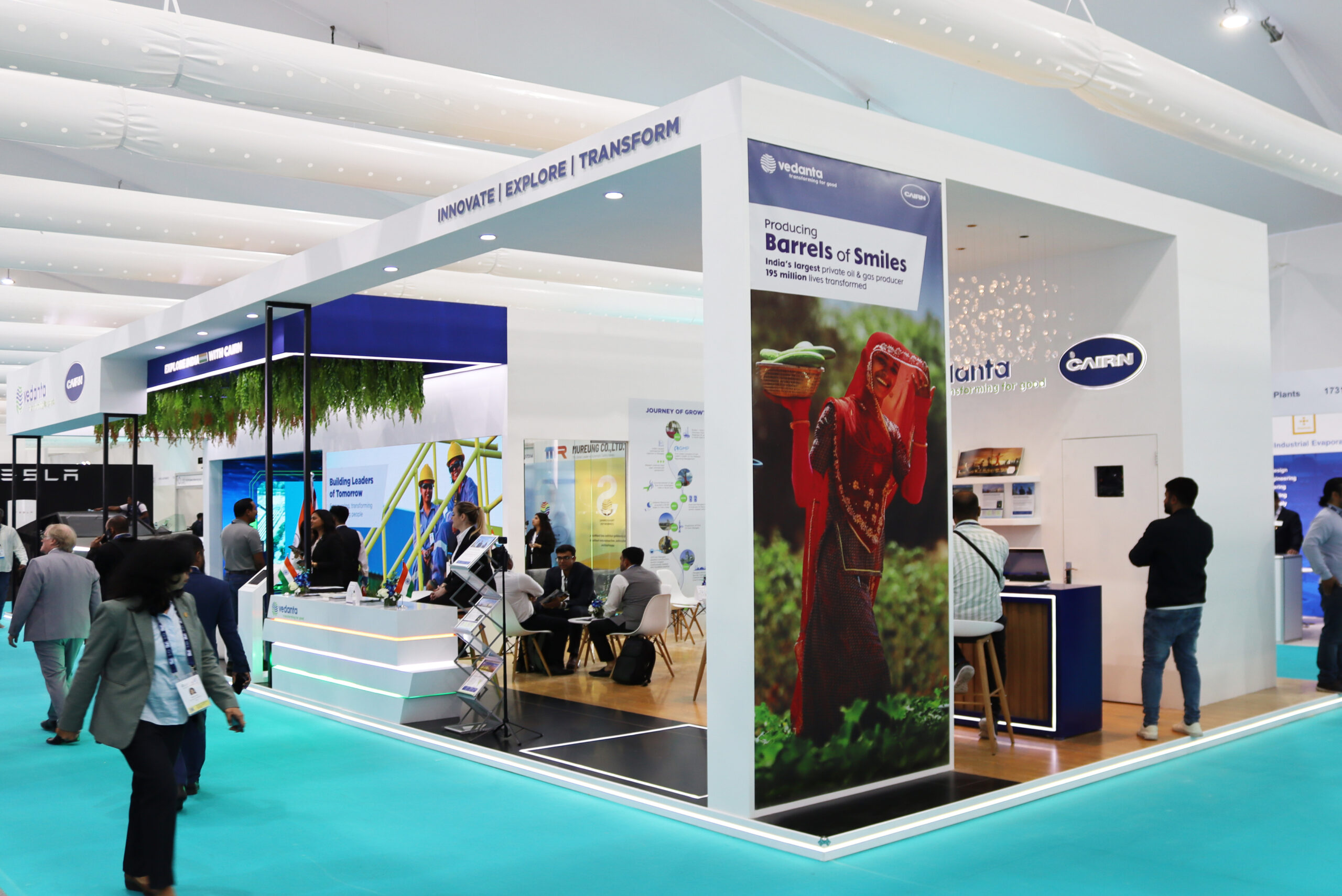 For our debut, we brought Vedanta's "Stand With" vision to life by transforming the customer journey. Our stand featured a presentation area and meeting spaces under a focal chandelier, all wrapped in a refreshing greenery theme—turning concept into elegant, sustainable reality.