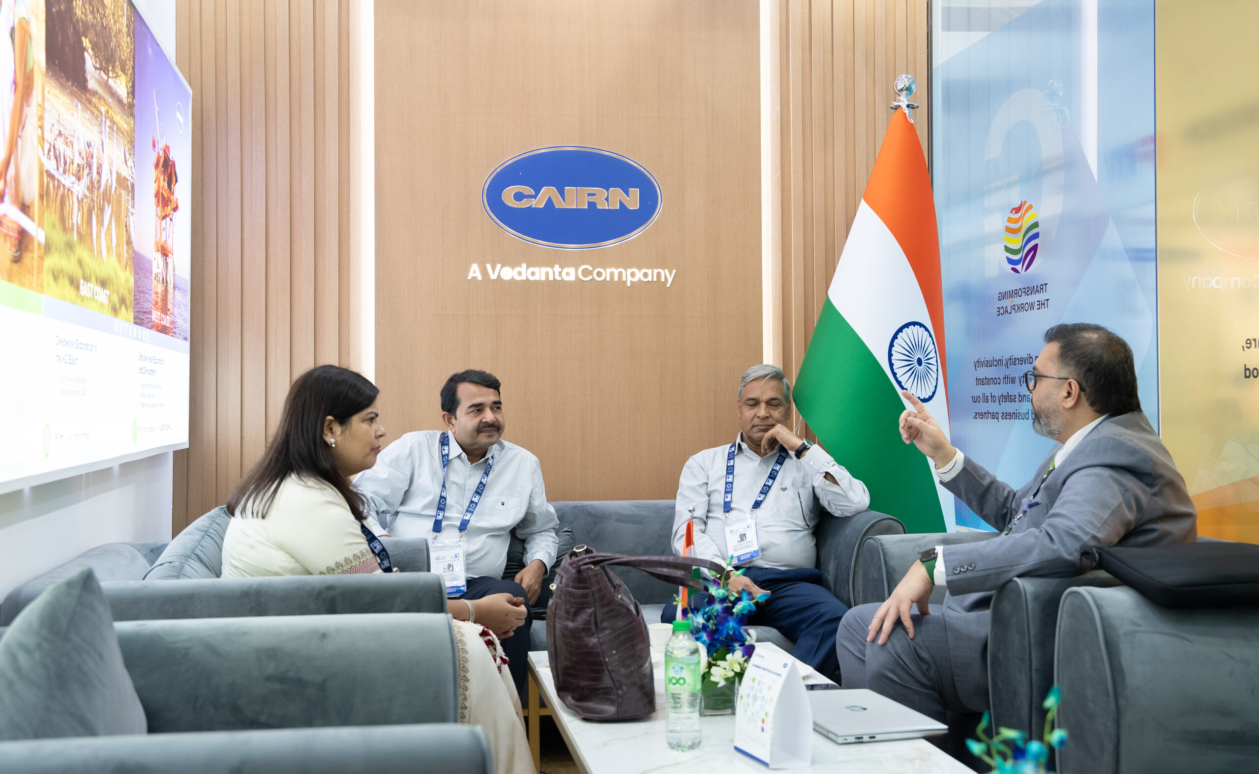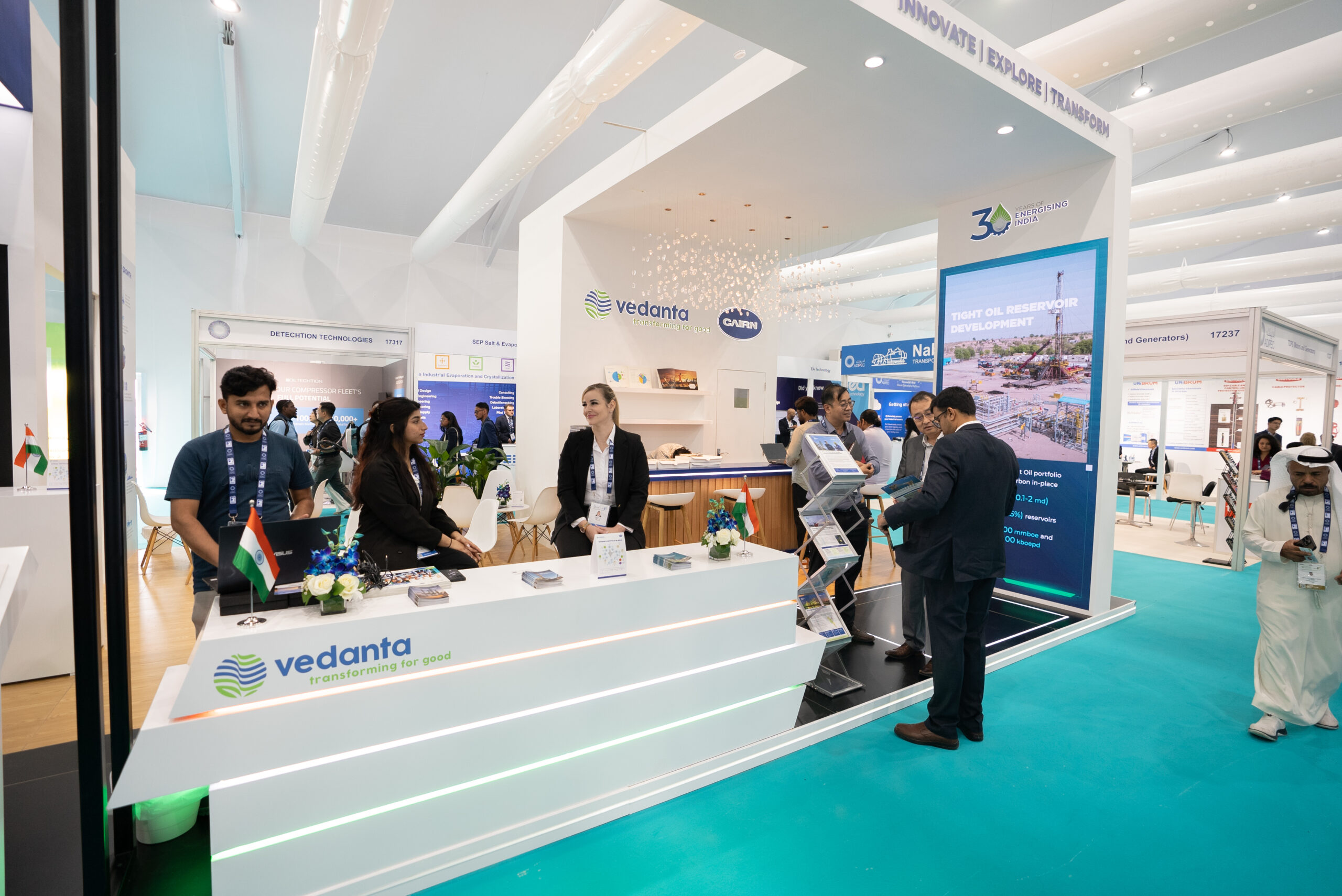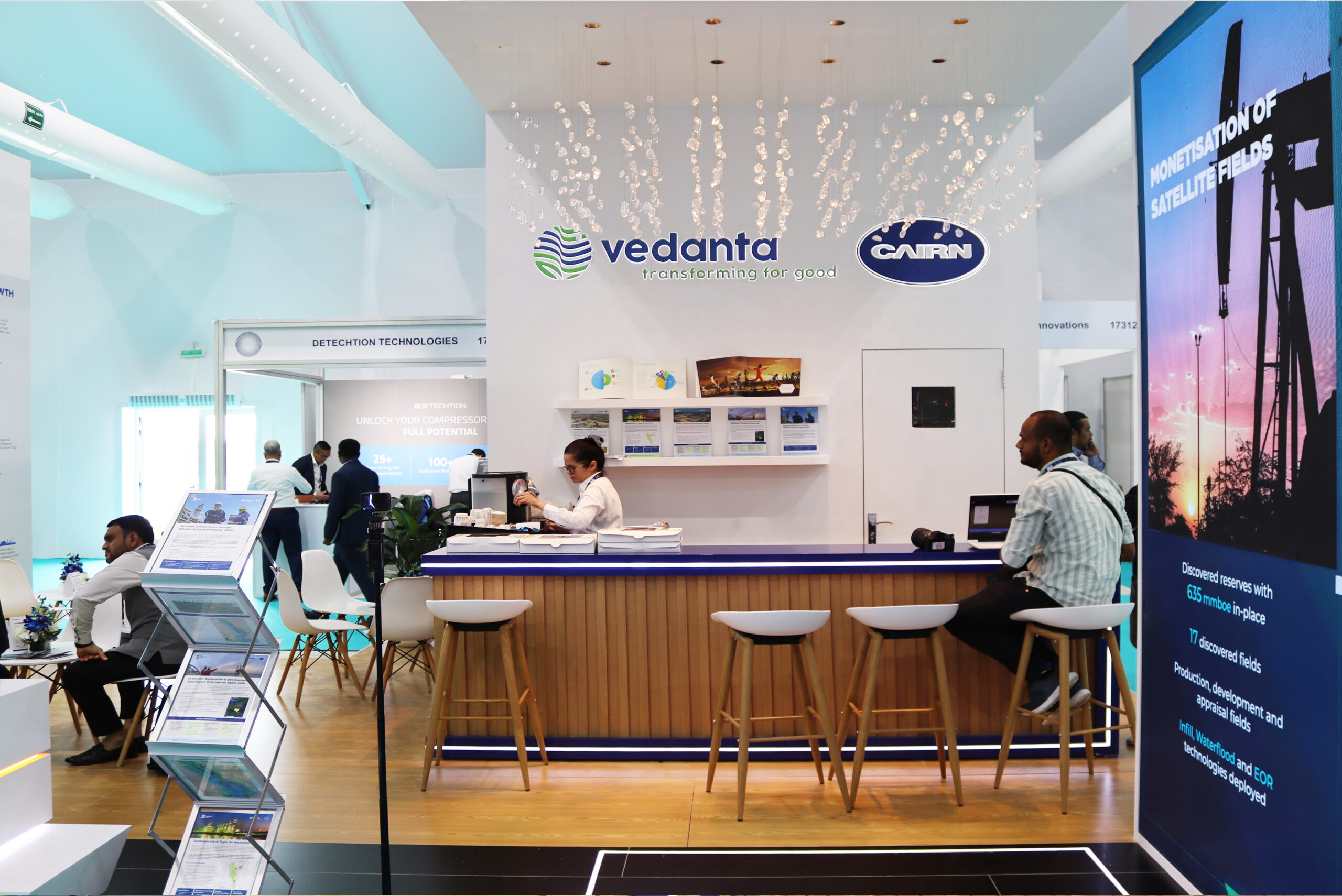 For our debut, we brought Vedanta's "Stand With" vision to life by transforming the customer journey. Our stand featured a presentation area and meeting spaces under a focal chandelier, all wrapped in a refreshing greenery theme—turning concept into elegant, sustainable reality.